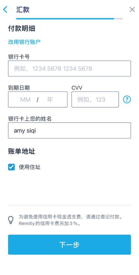 输入收款人信息,包括姓名、地址、与微信或支付宝账户绑定的身份信息及银行账户。目前,Remitly同时支持使用大陆/境外号码向微信转账。